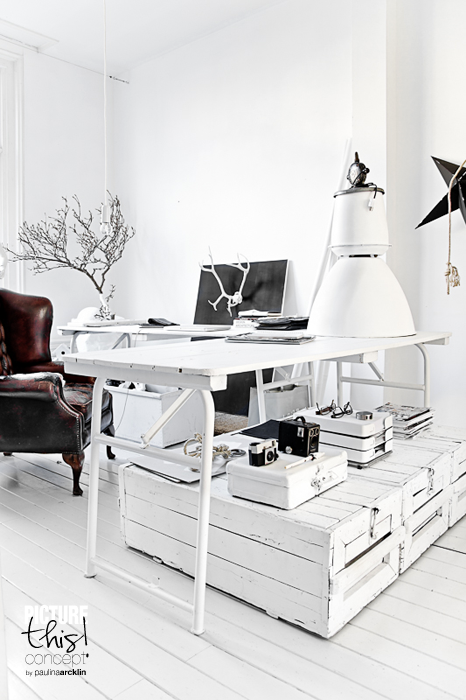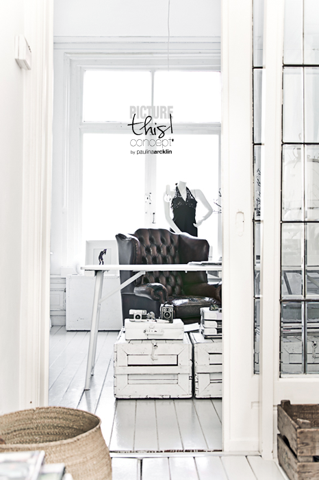 2 x white, different looking industrial lamp to the hall, 360volt.com. • Tine K white pillow to the living room • 2 x light grey leather carpets to the hall, Nordal • Industrial bench to the living room as sidetable, HKliving • 2 x Moroccan pouf to the living room, Boho-morocco.com • 3 x Kikoi basket + DIY white paint to the living room, Werannas.com.