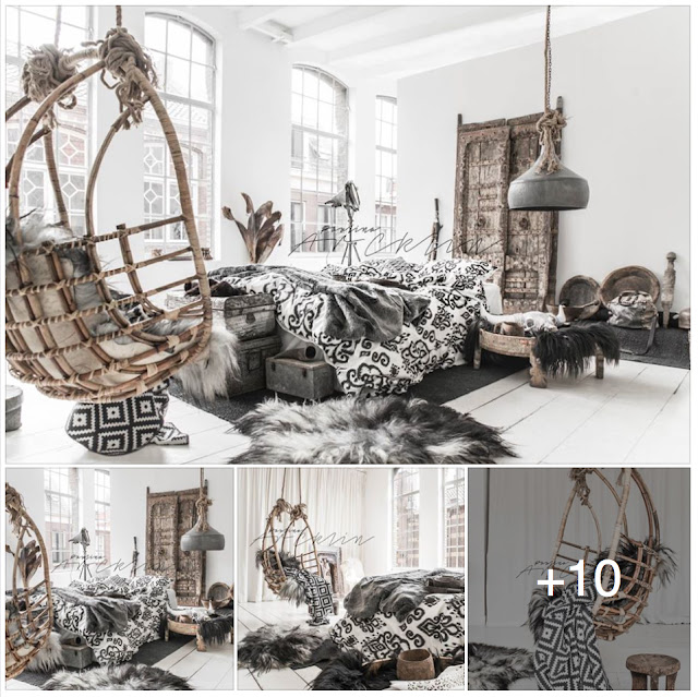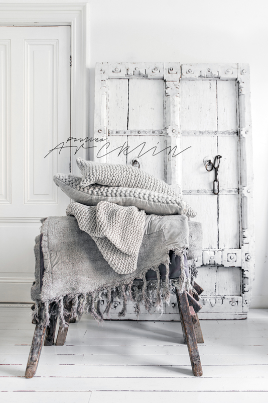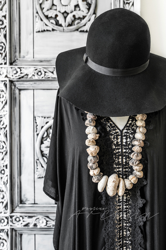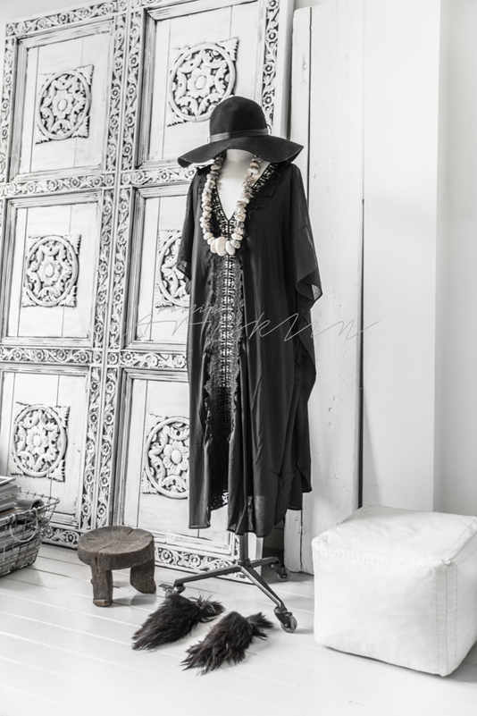 Black kaftan from Love Warriors. Stone necklace treasure from Marrakesh. Indian doors from De Weldaad store. Old African milking stool from Weranna’s. White square leather pouf from Mono Deco.